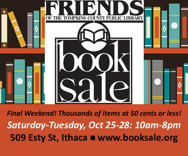 Final weekend of the Friends of the Library Book Sale at 509 Esty St, Ithaca. Saturday Oct 25 to Tuesday Oct 28, hours: 10am-8pm. Thousands of books, DVDs, CDs & more. Prices start at 50 cents and drop daily. Monday, Oct 27: all items on the main floor are just 10 cents each! Tuesday, Oct […]