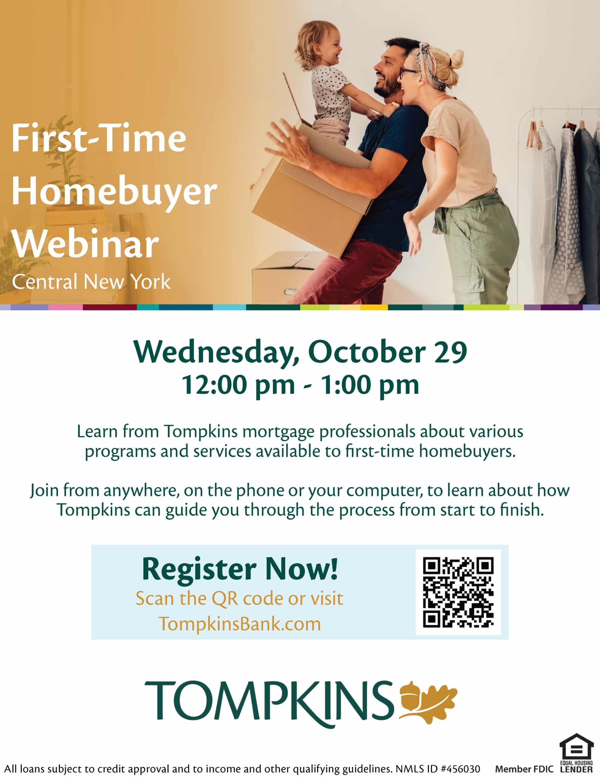 Join Tompkins Community Bank’s team of mortgage professionals to learn about various programs available to first-time homebuyers. To attend, please register here: https://webinar.tompkinsbank.com/first-time-homebuyer-cny
