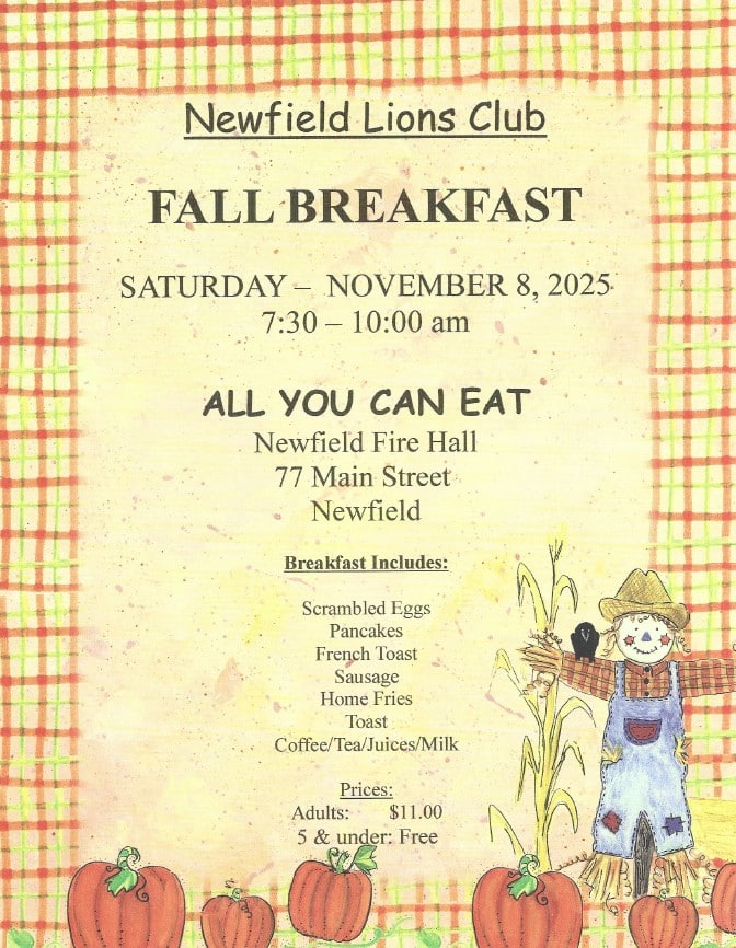 Join the Newfield Lions Club for breakfast on Saturday, Nov. 8 from 7:30-10 a.m. at the Newfield Fire Dept. Scrambled eggs, pancakes, french toast, sausage, home fries, toast, and beverages for $11. Children under 5 are free.