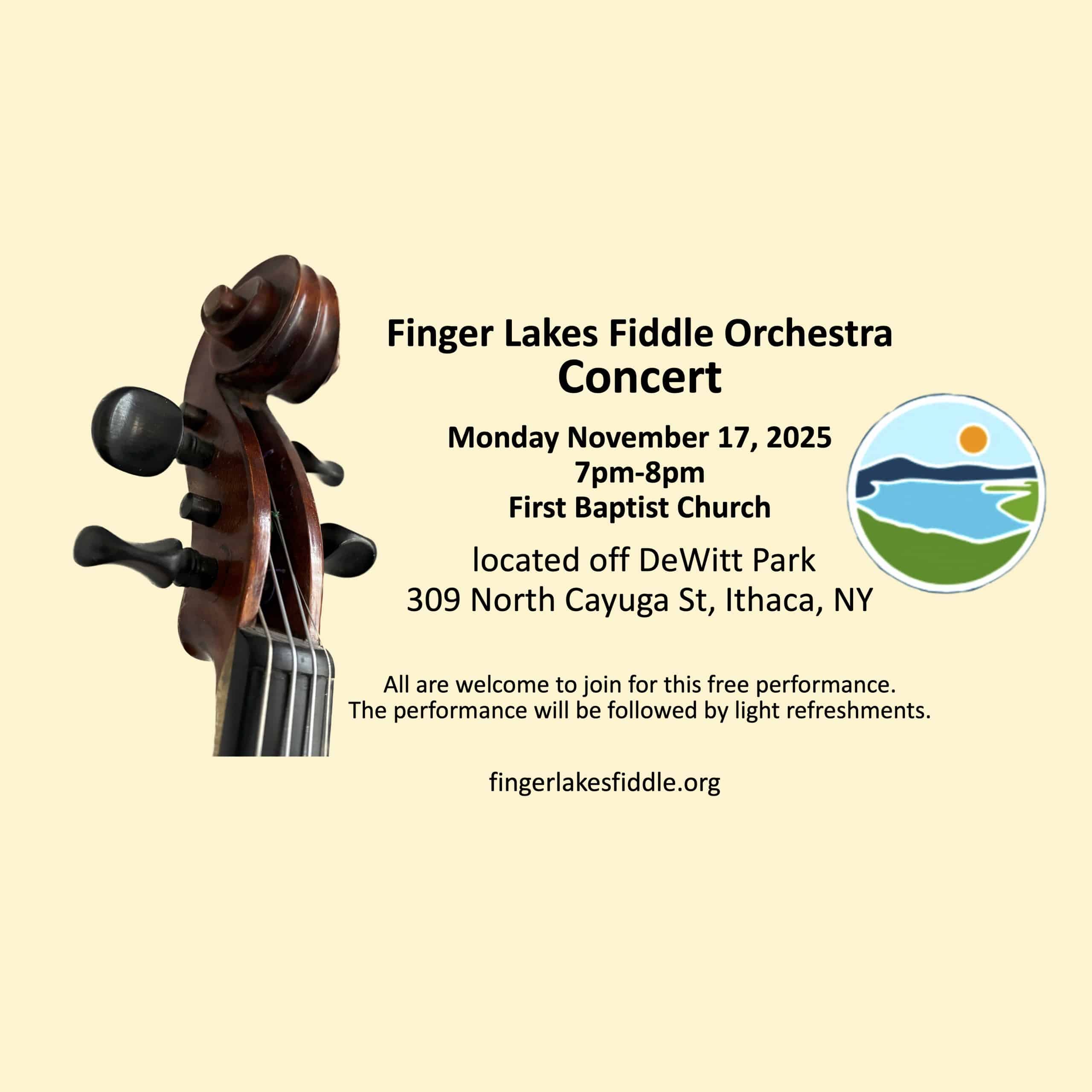 Finger Lakes Fiddle Orchestra Concert Monday November 17, 2025, 7pm-8pm, First Baptist Church (located off DeWitt Park 309 North Cayuga St, Ithaca, NY); all are welcome to join for this free performance; the performance will be followed by light refreshments. https://fingerlakesfiddle.org/