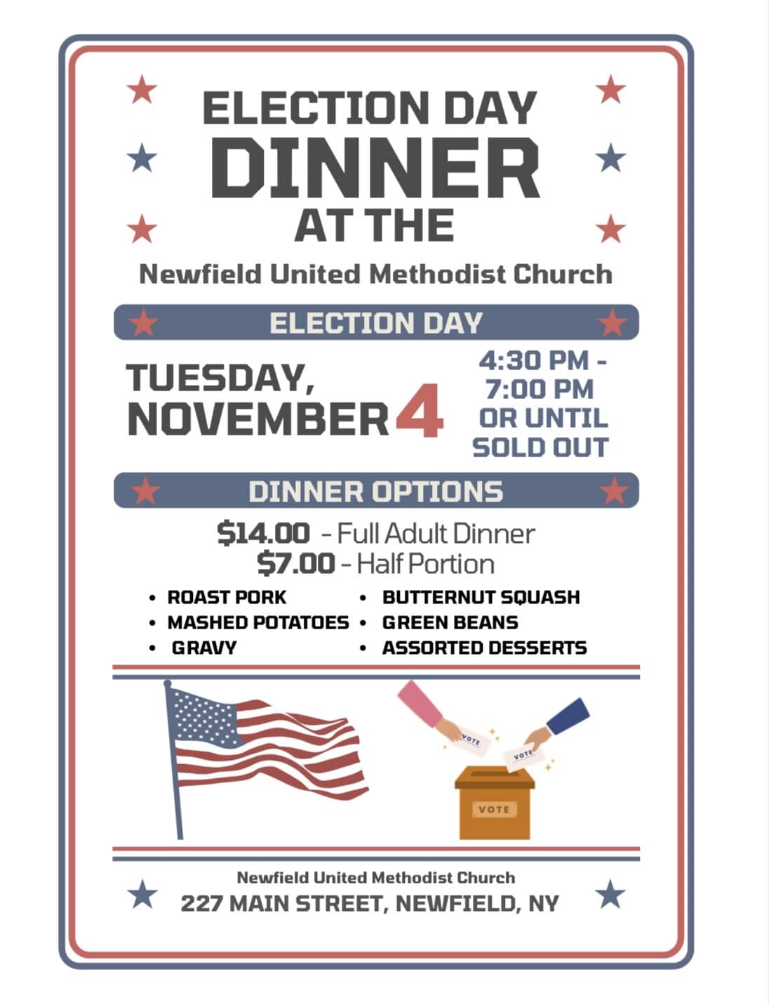 Election Day Dinner includes roast pork, mashed potatoes, gravy, butternut squash, green beans, assorted desserts. $14 for a full adult dinner, $7 for half portion. Dine in or take out.