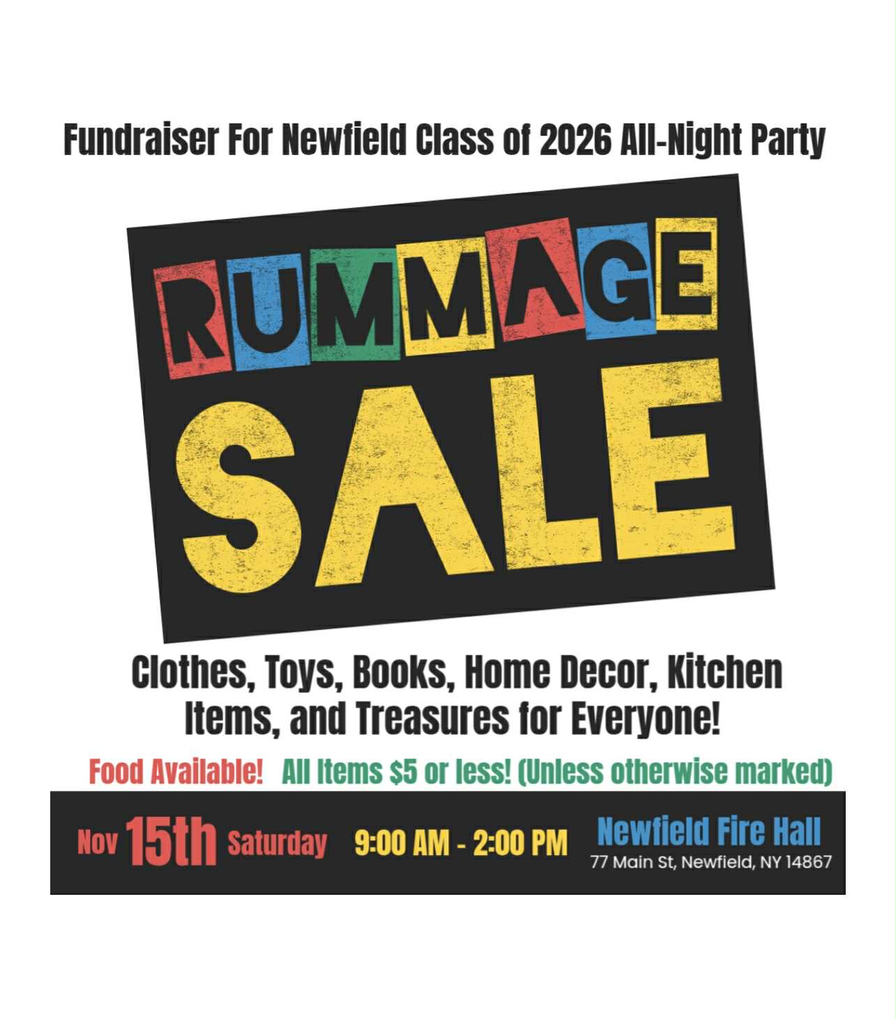 Come to the Rummage Sale fundraiser for the Class of 2026 All-Night Party on Saturday, Nov 15 at 9 a.m. - 2 p.m. at Newfield Fire Hall. Clothes, toys, books, home decor, kitchen items, and treasures for everyone! Food available. All items $5 or less unless otherwise marked.