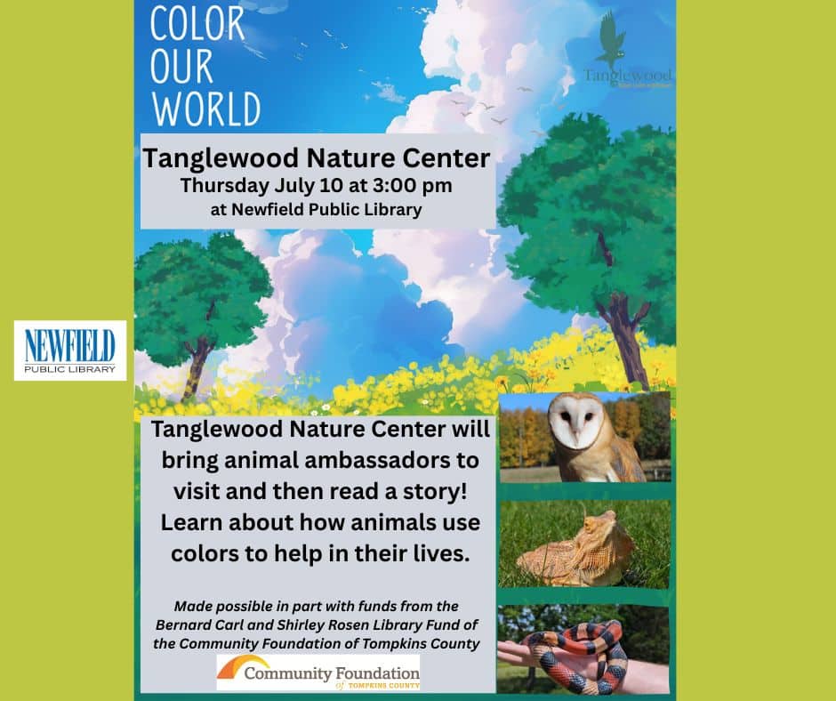 The Tanglewood Nature Center will be at the library on Thursday, July 10 at 3pm with four animal ambassadors. Learn how animals use colors to help them in nature and how they can see colors differently.