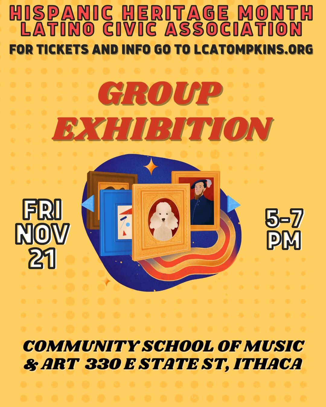 Join us for a vibrant group exhibition showcasing talented Latine artists from within 100 miles of Ithaca. Come meet the artists, buy unique works of art, enjoy appetizers, and learn more about the Latino Civic Association and curators Loreto Molina & Yen Ospina.